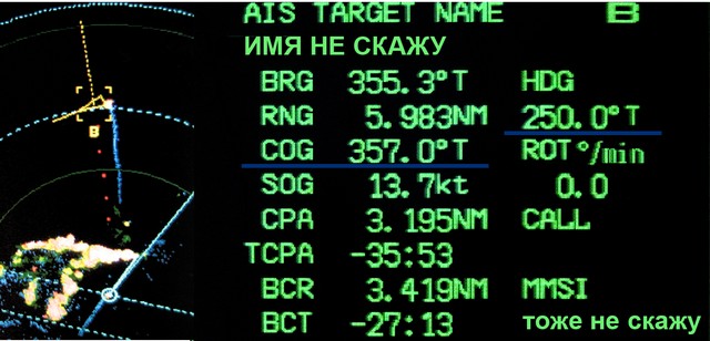 Но, наблюдая за целью, заметили, что пеленг на цель особо не изменяется. Результат вы видите на картинке. Разница между гирокомпасным курсом и курсом относительно грунта составляла 110 градусов. По факту цель следовала на север и пресекала курс судна. Такие ошибки AIS не единичны. Будьте бдительны.